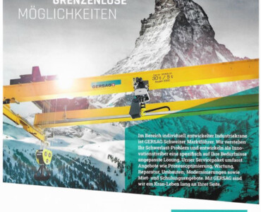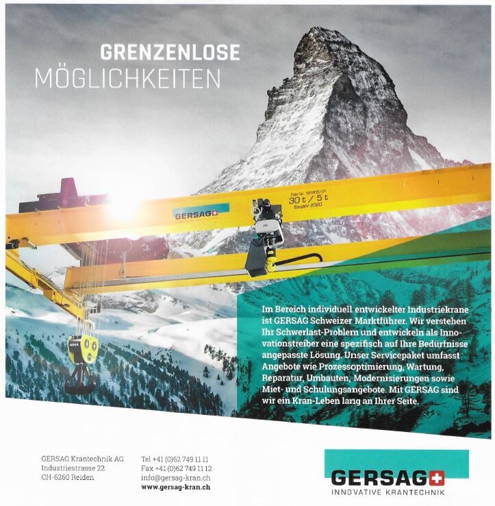 Die Titelseite vom Baublatt präsentiert den neuinstallierten Zweiträger-Brückenkran vor der imposanten Kulisse des Matterhorns und steht symbolisch für unsere starke Leistung am Matterhorn.