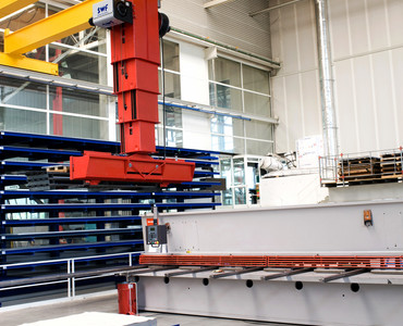 Der Stapelkran lässt sich wie üblich durch Flur- oder Funkfernsteuerung bedienen. Eine programmierte, vollautomatische Variante ist als Option erhältlich: beispielsweise für die Bedienung eines Palettenregals. Dank Wegmesssystemen ist die Steuerung stets informiert, wo sich der Kran gerade befindet. In Kombinationen bedient dieses «Multitalent» z.B. den hinteren Hallenteil als automatisches Blechlager, im vorderen Hallenteil unterstützt er manuell gesteuert die Produktion.