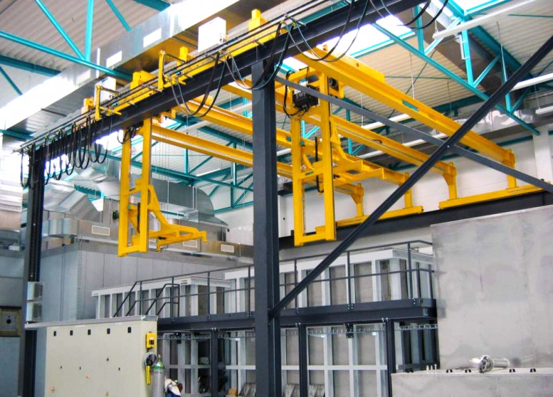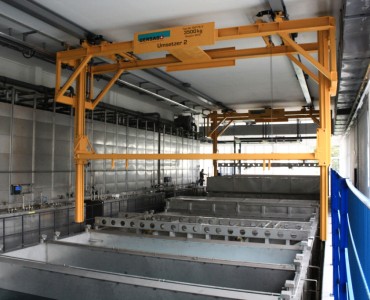 Anwendung finden solche Anlagen zum Beispiel in der Oberflächenbehandlung, wobei der Umsetzer bestückte Gehänge nach verschiedenen Programmen durch unterschiedliche Bäder taucht und dort absetzt. Je nach Medium sind unterschiedliche Tauchzeiten gegeben, welche durch die vollautomatische Steuerung exakt eingehalten werden.